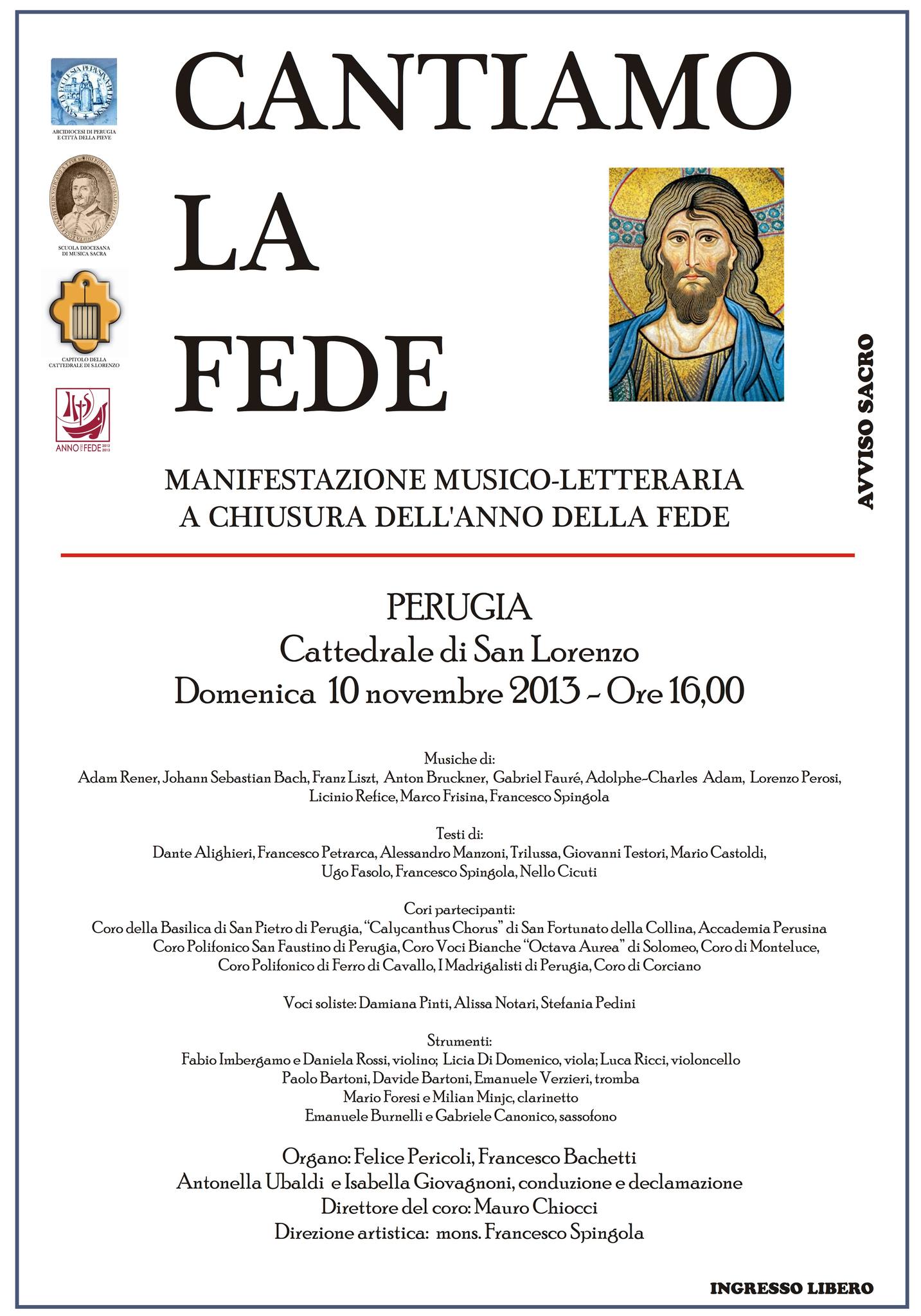 10 novembre 2013: Partecipazione del Coro “Octava Aurea” alla manifestazione musico-letteraria “Cantiamo la Fede”, a chiusura dell’Anno della Fede, Cattedrale S.Lorenzo, Perugia, ore 16.00; Direttore del Coro: Mauro Chiocci, Direttore artistico: Mons. Francesco Spingola. Esecuzione di un Preludio. Direttore del Coro “Octava Aurea”: Mario Cecchetti