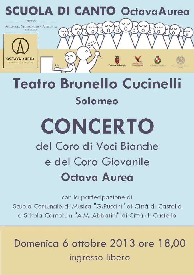 6 ottobre 2013: Concerto Coro di Voci Bianche e Coro Giovanile Octava Aurea, con la partecipazione di Ensemble Scuola Comunale di Musica “G.Puccini” e Schola Cantorum “A.M.Abbatini”. Pianoforte: Yuko Watanabe. Direttore: Mario Cecchetti. Teatro Cucinelli, Solomeo, ore 18.00.