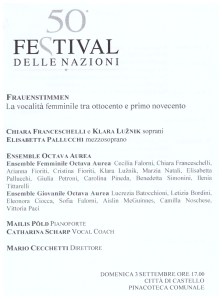 3.9.2017 – “Frauenstimmen”, La vocalità femminile tra ottocento e prima novecento. Concerto dell’Ensemble Femminile e Ensemble Giovanile “Octava Aurea”. Con la partecipazione di Chiara Franceschelli e Klara Luznik (soprani) e Elisabetta Pallucchi (Mezzosoprano). Piano: Mailis Pold. Vocal Coach: Catharina Scharp. Direttore: M° Mario Cecchetti. Pinacoteca Comunale, Città di Castello, 50° Festival delle Nazioni, ore 17.00.