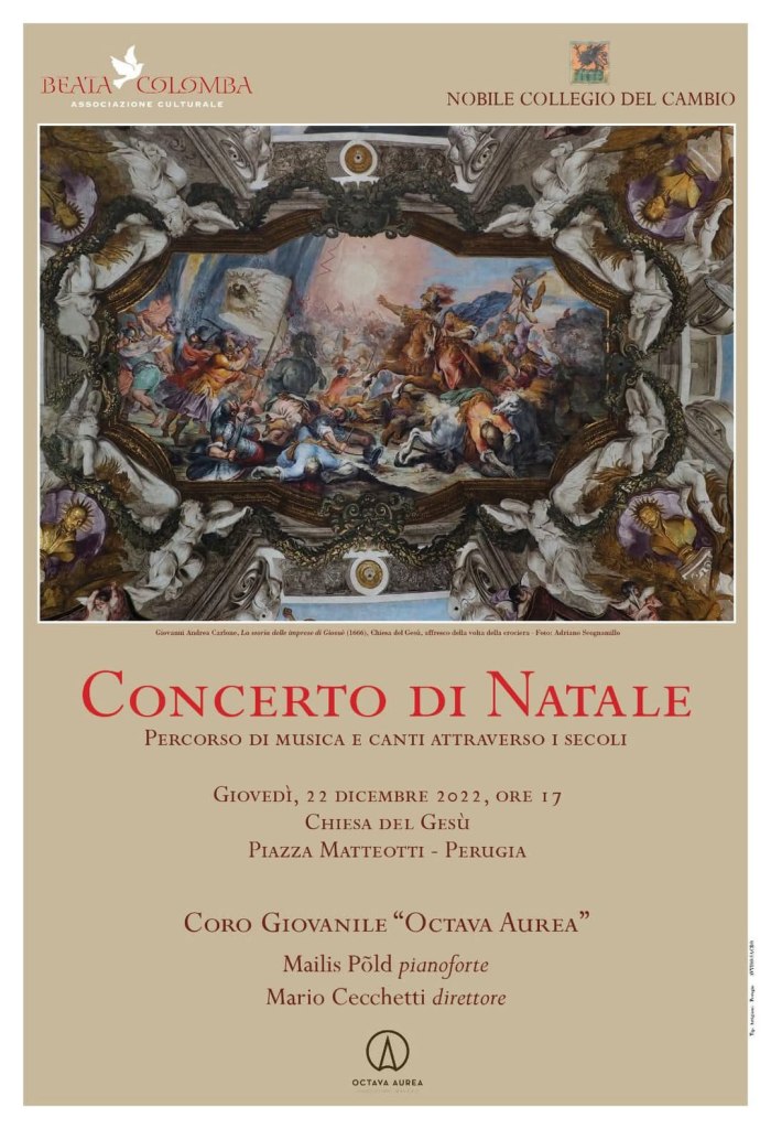 22.12.2022. Concerto di Natale. Concerto del Coro giovanile e voci bianche “Octava Aurea”. Direttore del Coro “Octava Aurea”: Mario Cecchetti. Pianoforte: Mailis Pold. Preparatrice Vocale: Catharina Scharp. Chiesa del Gesù, Piazza Matteotti, Perugia, ore 17.00.